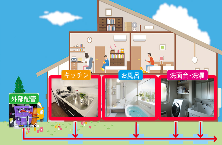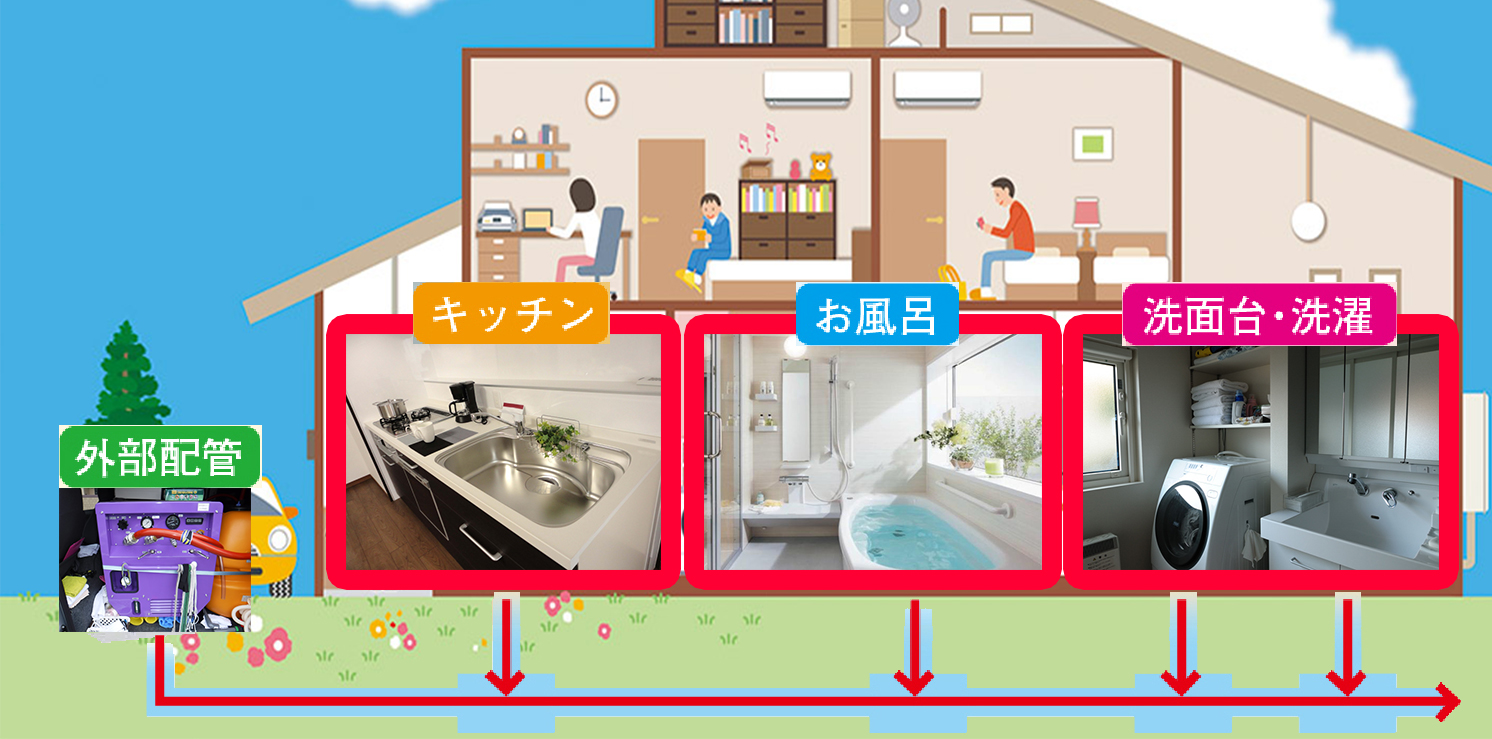 作業箇所は台所・浴室・洗面・洗濯排水管から、外部排水管最終桝までまるごと一式の洗浄です。(トイレの洗浄はオプション料金となります。)